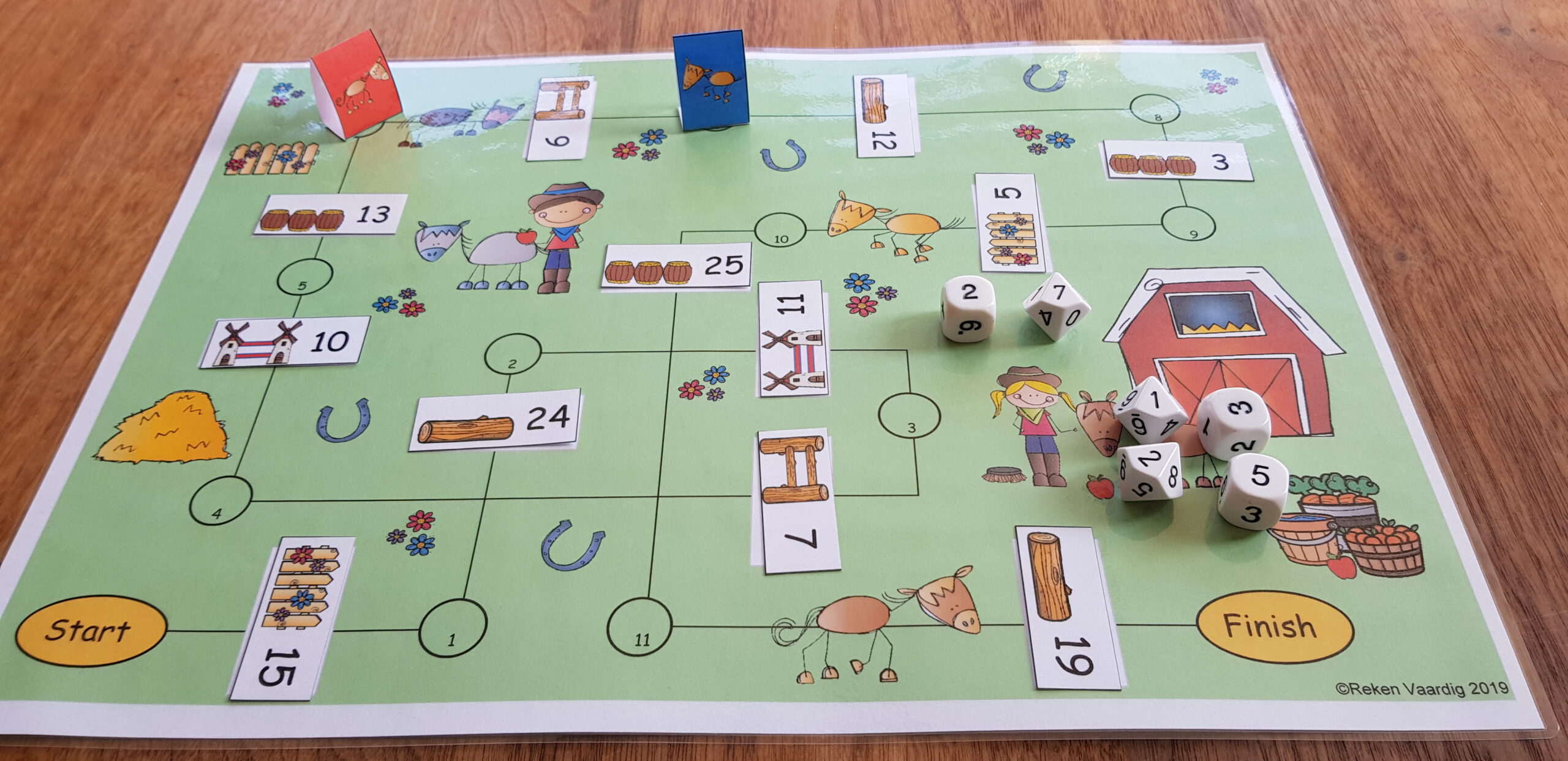 Gooi met alle 6 de dobbelstenen en probeer een som te maken waarvan de uitkomst op de hindernis staat. Je mag plus-, min-, keer- en deelsommen maken maar ook combinaties hiervan, bv. met dobbelstenen 2, 3 en 4 kan je maken: 3×4=12 en dan 12:2= 6. Of misschien heb je een dobbelsteen met het getal er al op, dan mag het ook met 1 dobbelsteen. Lukt het, dan mag jouw paard over de hindernis springen en mag je met de overgebleven dobbelstenen nog een keer gooien om de volgende hindernis te nemen. Je mag doorspelen tot alle dobbelstenen gebruikt zijn of tot je geen som meer kunt maken. Dan is de volgende speler aan de beurt. Wie als eerste over de finish komt heeft gewonnen.